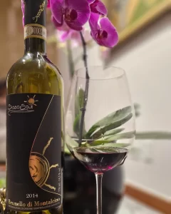 3.Sasso di Sole Brunello di Montalcino 2014 – vinho sensacional. A cor era de um rubi médio e vibrante. No nariz uma mistura de frutas vermelhas (morango, groselha) e negras com toques de tabaco. Também tinha algo de grafite muito delicado. Na boca estava muito equilibrado, elegante e fresco mesmo depois de quase uma década de vida. Esse Brunello é muito bom, recomendo. Feito 100% com Sangiovese, ele estagiou 40 meses em barricas de mil litros da Eslovênia e 12 meses em garrafa. Tem 14,5% de álcool e custa cerca de 30 euros. Se achar, compre! Vale à pena demais.